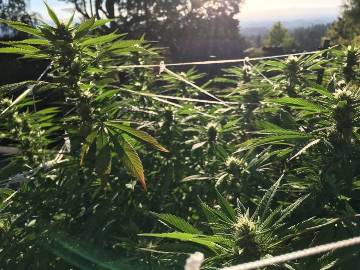 9/18/2016: This was quite possibly the worst year on record for weather when it comes to growing marijuana. The Summer was plenty warm but during the flowering phase, the plants have to stay dry (well the flowers do; you still have to water like mad). We had a bunch more rain coming in so Sarah and I had to build this make-shift shelter for the plants from a bunch of plastic. My lord what a pain. It rained a bunch and the humidity was high and the concern was the plants starting to mold. The flowers themselves are very sticky with what seems/looks like sugar but is actually the trichomes (see below). These are magnets for mold and mildew.