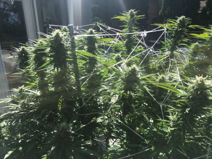 9/8/2016: Well, upon returning from Burning Man it turns out I hadn’t planned ahead on how heavy these plants get. Especially with a little rain. My Mom was a trooper and did her best even though two of the plants basically imploded on themselves. I got a little wonky and shored it all up with garden stakes and netting. You can also see the 5 gallon jug there that is full of nutrients. You start with nutrients that grow greenery and then later when the plants start to flower you change it up to encourage flower growth. Towards the end of the harvest I was having to fertilize at least every other day.
