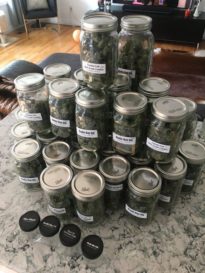 11/2/2016: Once the flowers have been dried, they go into glass mason jars with little packets that help keep the humidity at the ideal 62% while in the jars. Also, you have to burp the jars every single day in the first 3-4 weeks which I did and it was amazing to see the change in the smell of the flower during this process. This is what will make the smoking of these flowers much more smooth and it also helps enhance the potency as well.